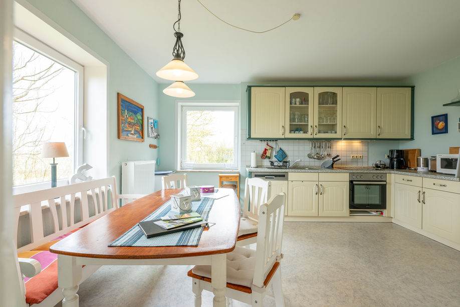 Im Parterre des Ferienhauses befindet sich eine sehr geräumige Küche mit Geschirrspüler, Mikrowelle, Kaffeemaschine etc., ein moderner Herd und eine einladende Sitzgelegenheit für bis zu 6 Personen.